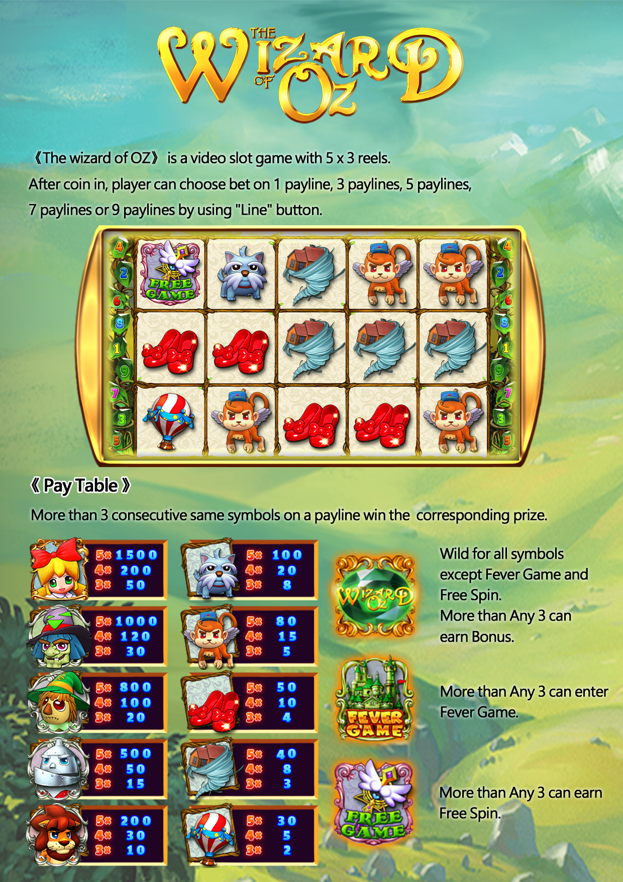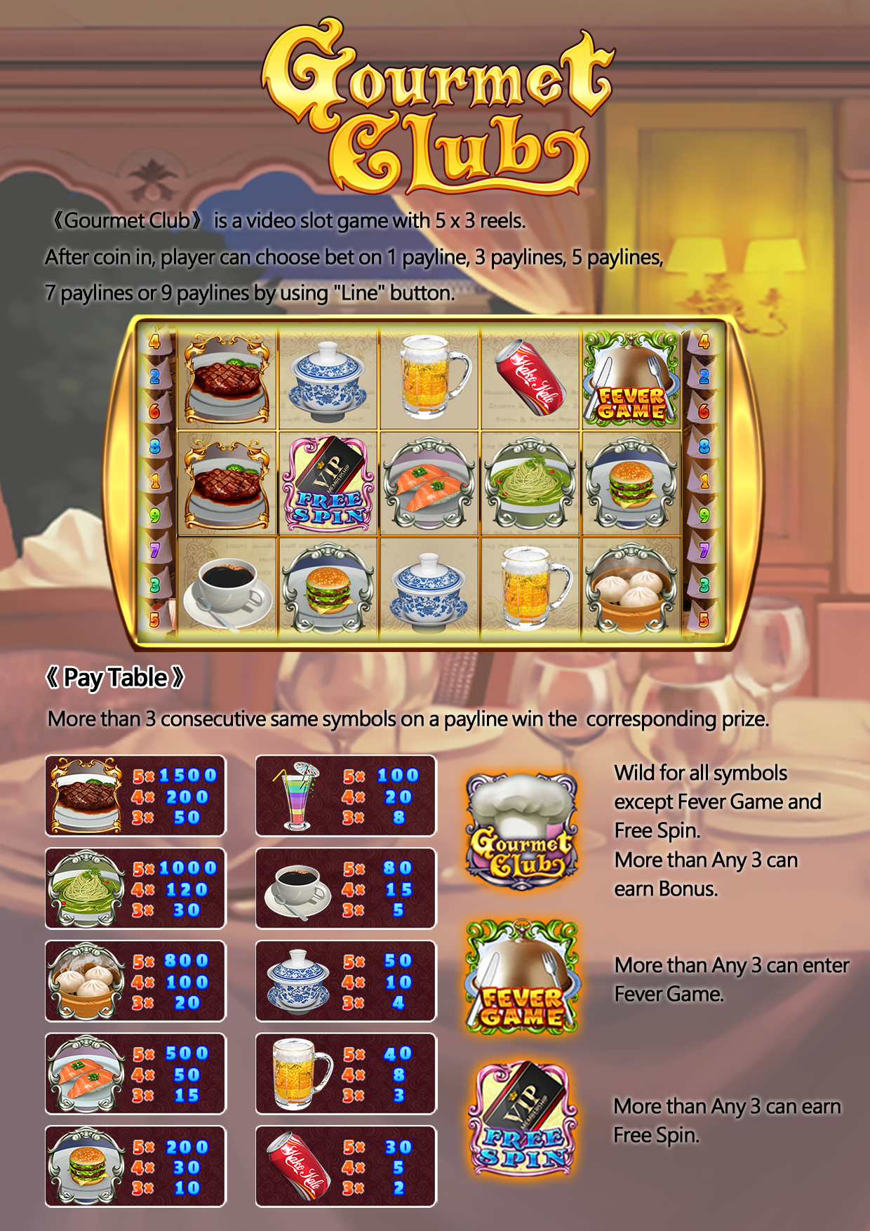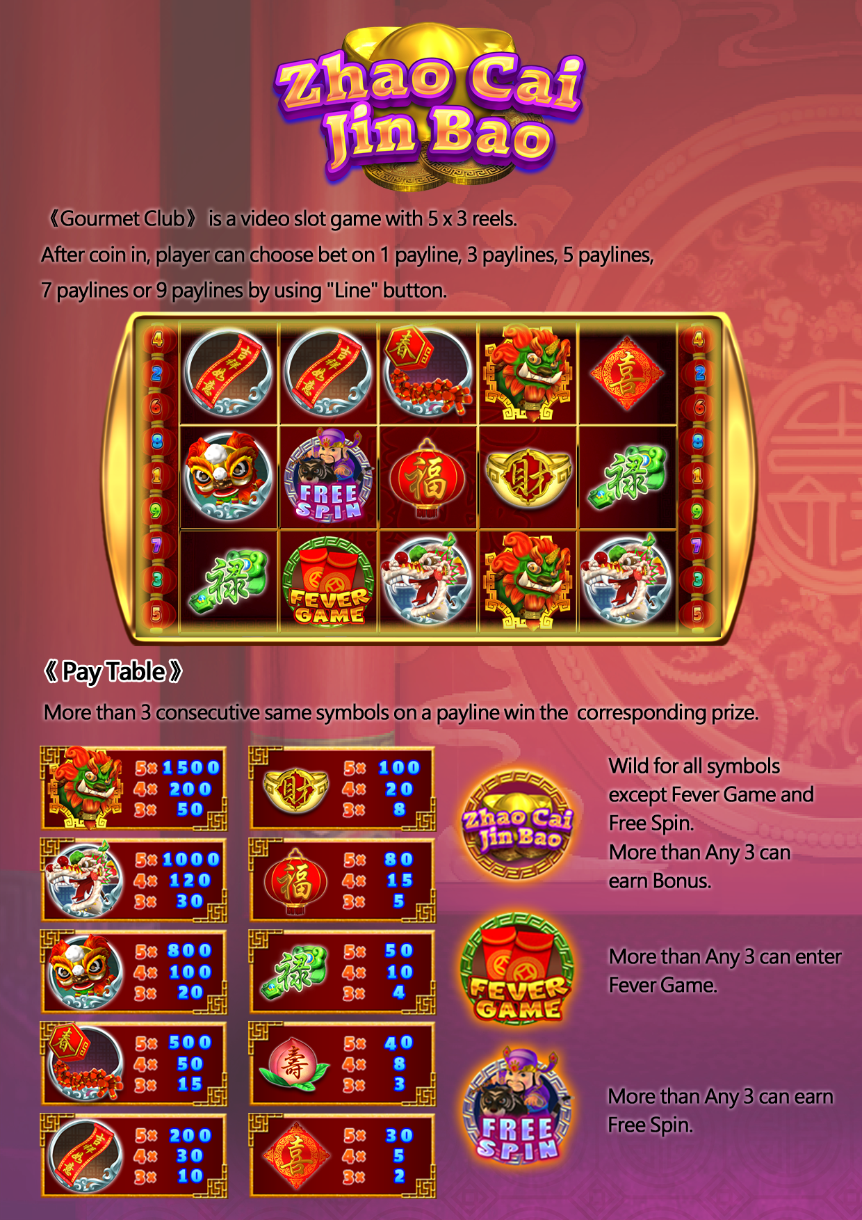 “Super Spinner” is a video slot game with 5 x 3 reels. After coin in , player can choose bet on 1, 3, 5, 7 or 9 paylines by using “Line” button.